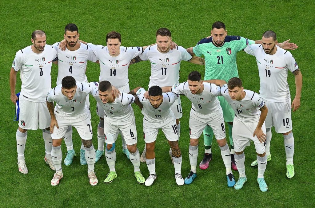 ITALIA (4-3-3): Donnarumma; Di Lorenzo, Bonucci, Chiellini, Spinazzola (79′ Emerson); Barella, Jorginho, Verratti (74′ Cristante); Chiesa (90′ Toloi), Immobile (74′ Belotti), Insigne (74′ Berardi). All. Mancini