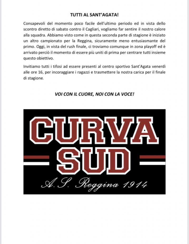“Consapevoli – si legge nel comunicato – del momento poco facile dell’ultimo periodo ed in vista dello scontro diretto contro il Cagliari, vogliamo far sentire il nostro calore alla squadra. Abbiamo visto come in questa seconda parte di stagione è iniziato un altro campionato per la Reggina, sicuramente meno entusiasmante del primo. Oggi, in vista del rush finale, ci troviamo comunque in zona play off ed è arrivato perciò il momento di essere uniti più di prima per centrare tutti insieme questo obiettivo”.