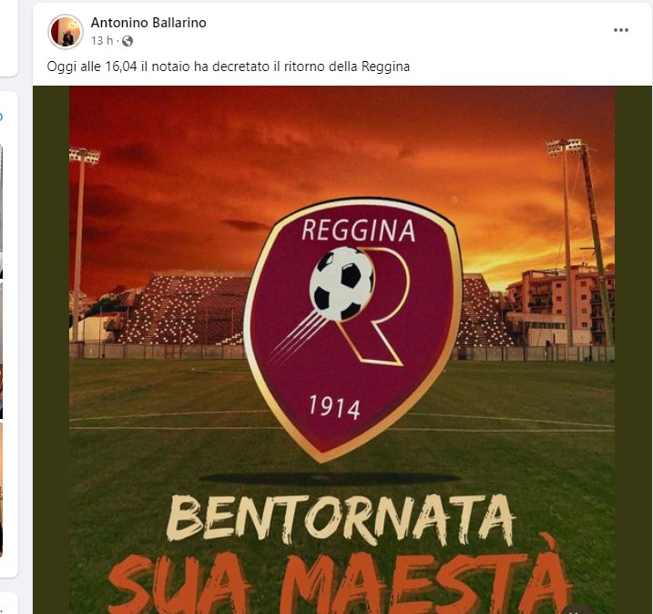 “Oggi alle 16,04 il notaio ha decretato il ritorno della Reggina“. Così tramite il suo profilo Facebook il patron Nino Ballarino ha lasciato intendere che ieri sia stata una giornata importante, con probabile riferimento al fatto che siano stati compiuti passi decisivi per il cambio di denominazione della società a cui seguiranno i passi necessari al cambio di denominazione all’interno degli ambiti Figc.