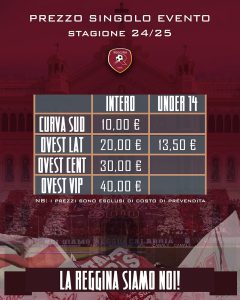 Sul territorio di Reggio Calabria, sarà possibile acquistare il tagliando d’accesso allo stadio presso il punto vendita autorizzato BCenters, sito in Via Sbarre Centrali, 260/b | aperto tutti i giorni dalle ore 9:00 alle ore 20:00 (orario no stop).