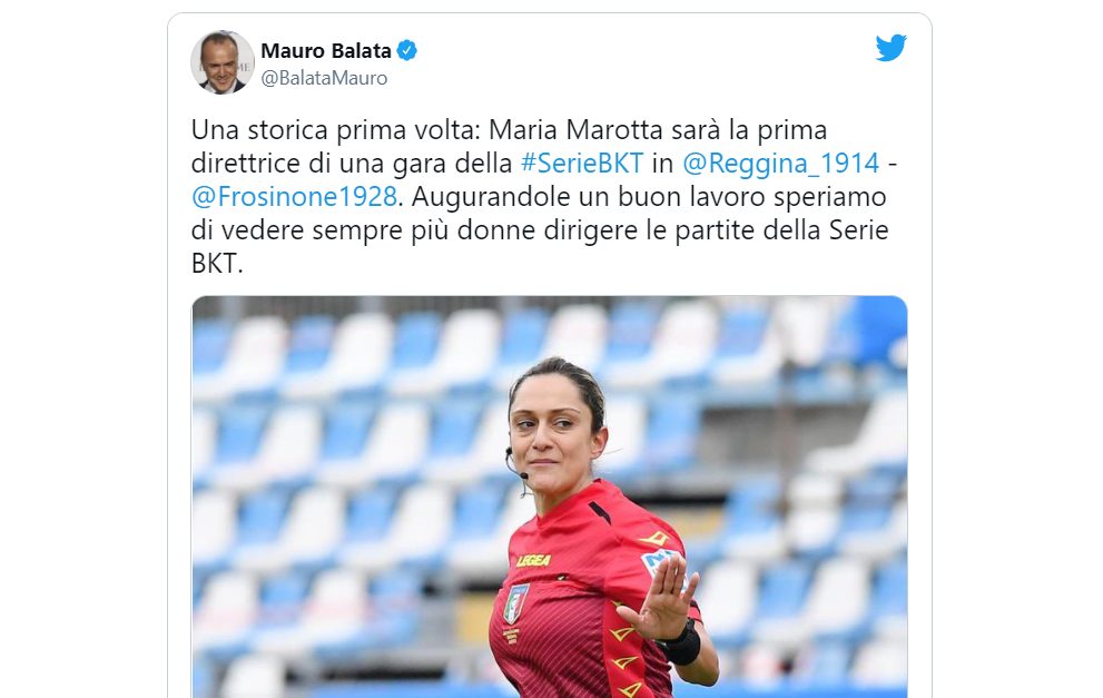 Il presidente della Lega B su Twitter augura buon lavoro al primo fischietto donna della B La designazione di Maria...